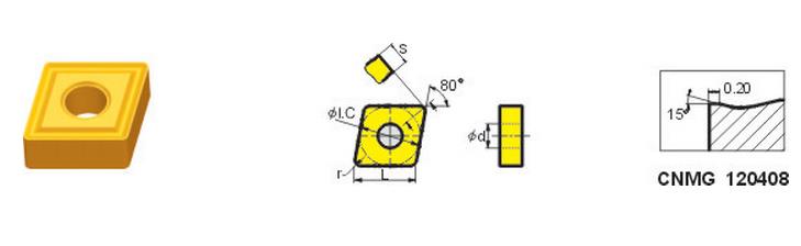 CNMG120404(YBD151):高耐磨性基體與MT-Ti(CN)、厚Al2O3、TiN 涂層的極佳組合,是球墨鑄鐵與灰口鑄鐵加工的首選牌號,允許有較高的切削速度。