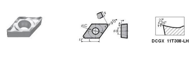 DCGX070204-LH(YD101):適用于鑄鐵、有色金屬尤其是鋁材的精加工、半精加工,亦可加工錳鋼、淬火鋼等硬質材料。